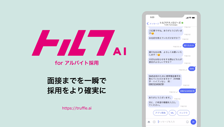 「Truffle AI forアルバイト採用」は、応募から面接実施までの採用業務を全て自動で完了するチャットボットです。店長が担っていた採用業務の多くをチャットボットが仲介することで、職場環境の紹介、応募受付、事前質問、事前審査、面接当日までの連絡等、採用担当者が面接と採用に集中できるように、採用プロセス全体を効率化していきます。既に大手グルメ予約サイトを運営する企業を販売パートナーにして拡張フェーズにあります。採用担当者の仕事を大幅に削減しながら、より確実な人材採用をサポートします。