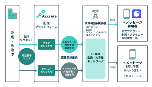 アクリートは2020年3月に、NTTドコモ、KDDI、ソフトバンクの3社が提供する「+メッセージ」公式アカウントサービスを一元的に企業、自治体等に提供するサービスを開始しております。アクリートによる「+メッセージ/SMS」の配信は携帯電話番号を用い、企業・自治体等から個人に対してメッセージを送信する際に、アクリート保有特許を活用し「+メッセージ」利用者にはリッチコンテンツ等を含むメッセージを、「+メッセージ」非利用者にはSMSによるテキストメッセージと、アクリートの配信プラットフォームにてメッセージ送信手段やコンテンツを適切に選択いたします。よって、「+メッセージを」ご利用いただく企業様には送信先ユーザーがどちらを利用できるのかを意識することなく送信することが可能です。