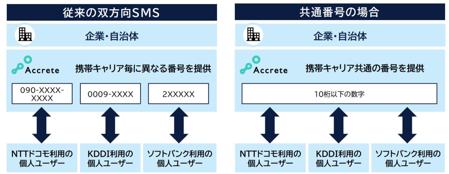 株式会社アクリート(本社:東京都千代田区、代表取締役社長:田中優成、以下「アクリート」)は、携帯電話事業者3社(NTTドコモ、KDDI、ソフトバンク)の企業向けSMS送受信番号を共通化し、双方向SMSによるコミュニケーションにおいてさらなる強化を図ってまいります。
