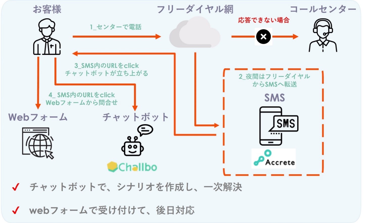 本システム連携により、営業時間外等のオペレーターが対応不可の場合でも、SMS(※1)を自動送信することで、お客様をお待たせすることなく、 チャットボット(※2)による自動応答及び自己解決を促したり、一次解決できなくてもWebフォームに誘導することで後日対応が可能となります。