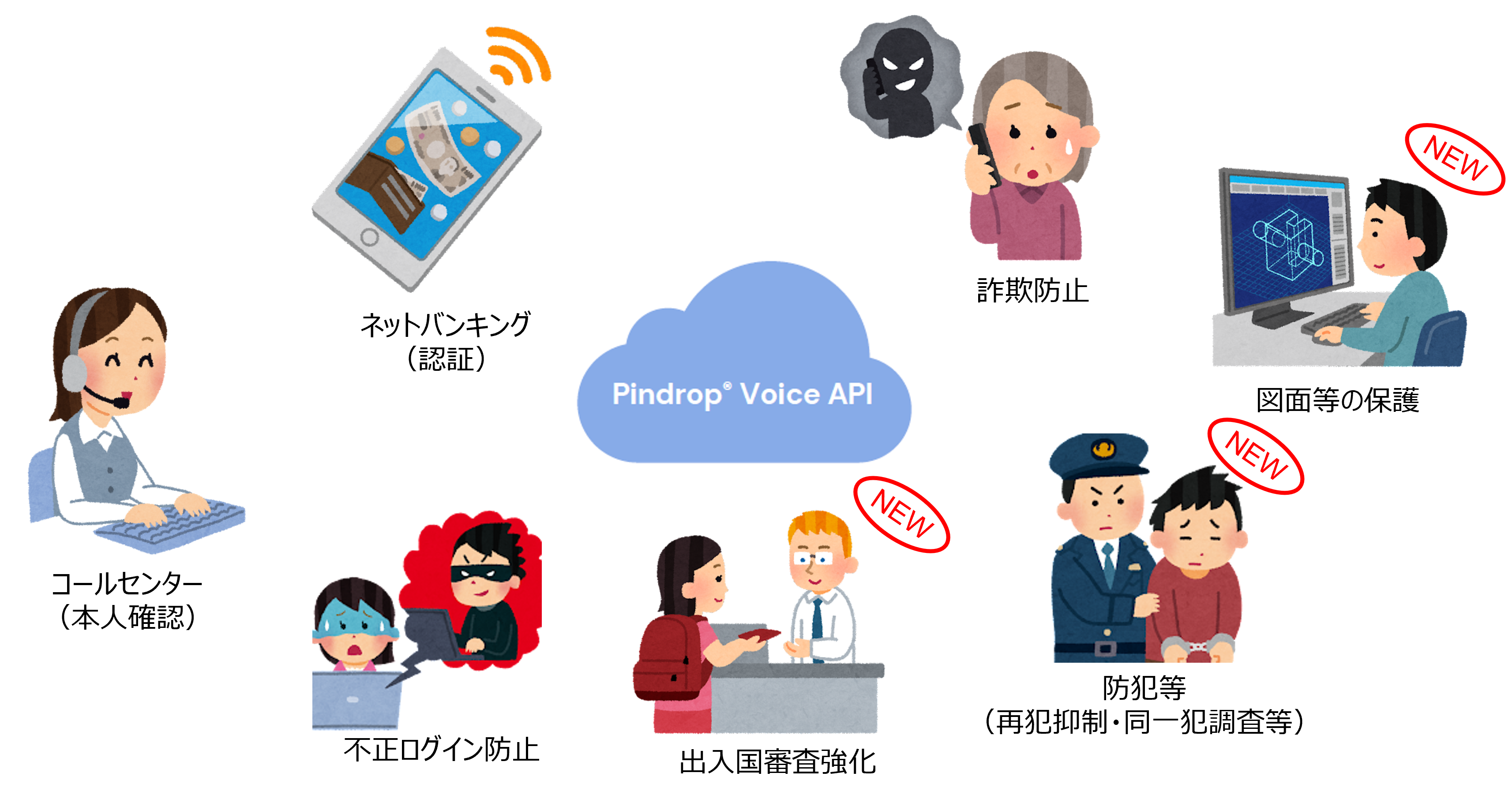 「Pindrop Voice API」は、通常10秒程度かかると言われている声紋認証の認証時間が2秒程度と極めて短時間で認証することができ、 この技術を各種業界のコールセンター等における本人認証に用いることで、これまで個人情報等に関する質問会話を通じて行われていた本人認証が、 自然な会話のみで認証を行うことが可能となります。これにより、サービスプロバイダは電話回線接続時間短縮に伴う業務効率向上およびコストの削減、 人件費の削減を実現でき、それと同時にエンドユーザーが感じる電話問い合わせに関する通話・認証のストレスを軽減することが可能となります。